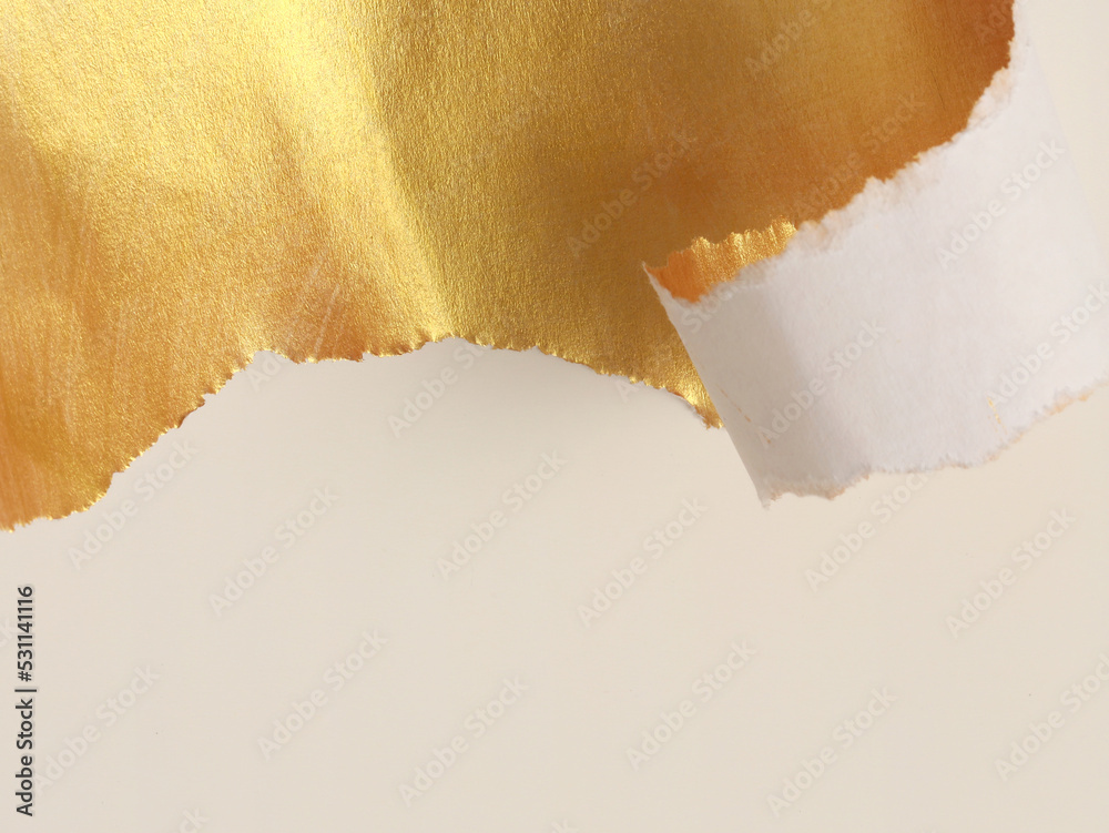 Gold torn empty pieces of texture paper on light beige copy space background.