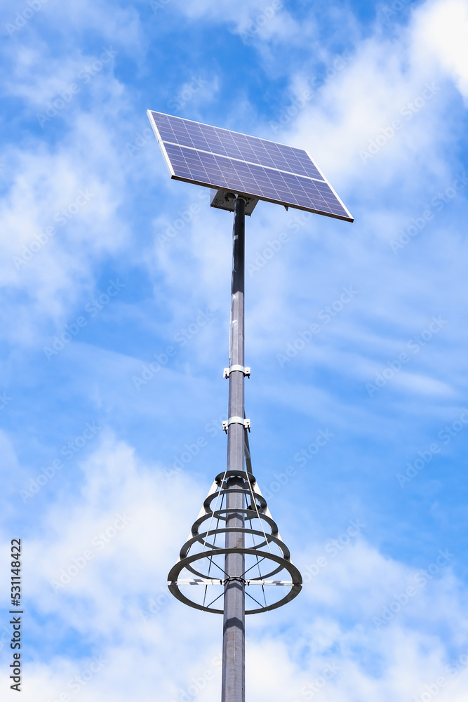 Solar panels on lampposts. Renewable energy sources in the countryside.