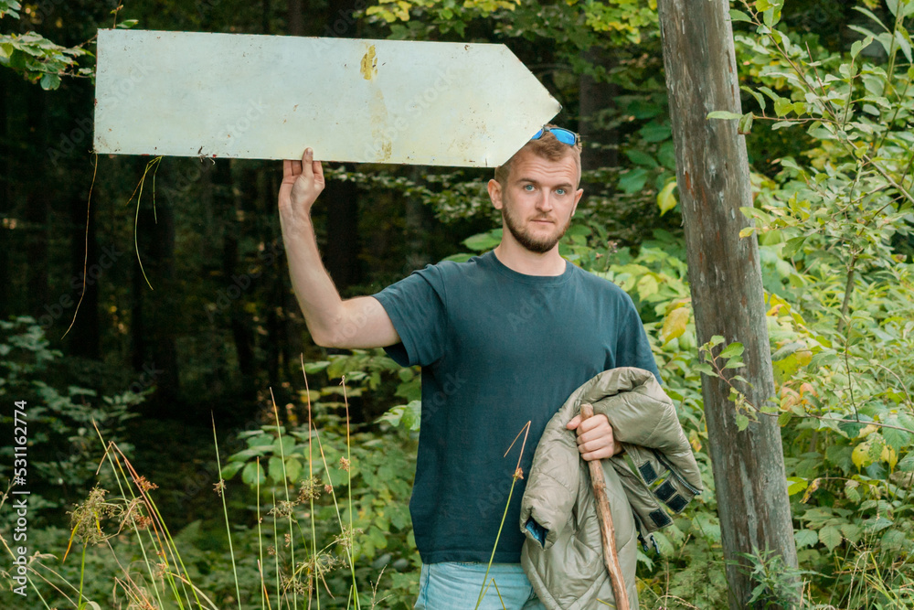 A man stands in the wood and holds a white direction arrow sign. Explore. Exploration. Enjoyment. Determination. Forward. Guide. Lead. Mysterious. Lost. Problem. Hike. Traveler. Portrait. Tourist