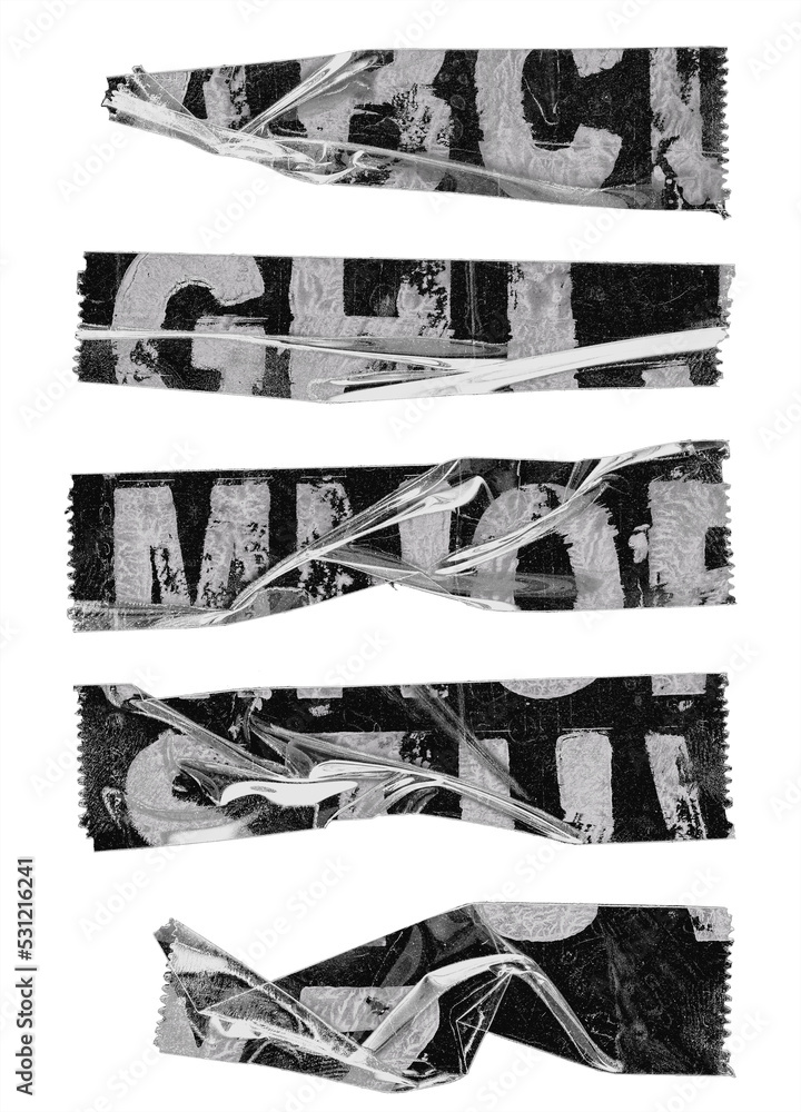 cool set of single transparent sticker tapes, crumpled stickies with letter texture.