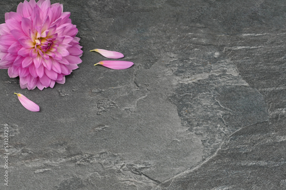 Rosafarbene Dahlienblüte auf einem Schiefer Hintergrund.