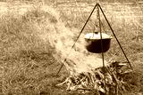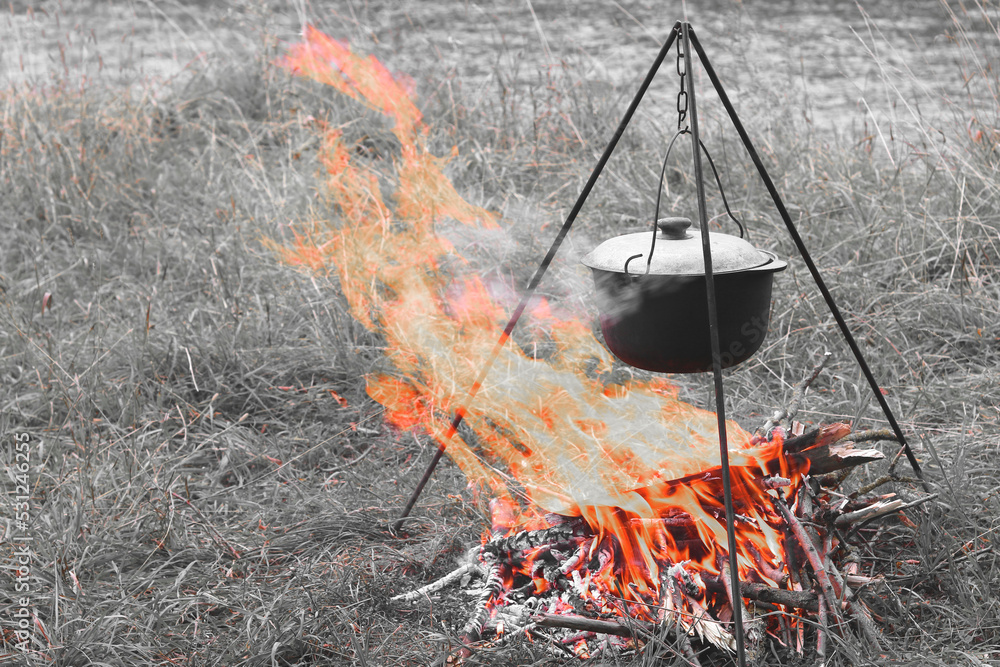 cooking delicious tasty food outdoors on fire in iron pot in summer in good weather with wood from forest