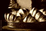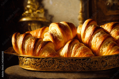 Close-up of a metal basket filled with golden French croissant, famous pastry from France