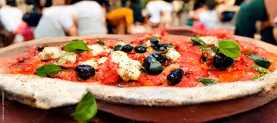 Italian pizza presented on the terrace of a restaurant in Italy, outside, for Italian pizzeria menu