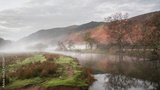 Stunning Autumn landscape sunrise image looking towards Borrowdale Valley from Manesty Park in Lake District with fog rolling across the landscape