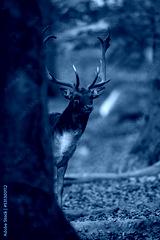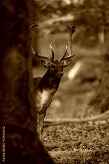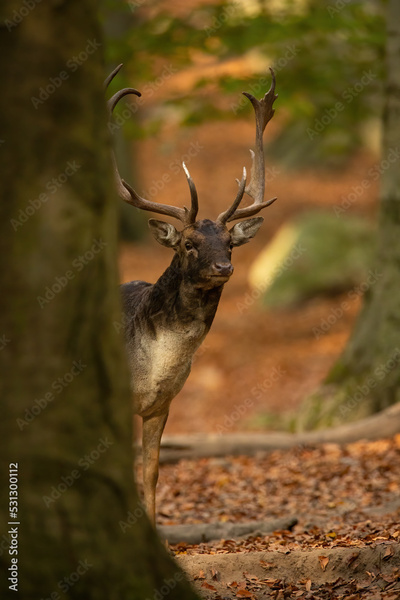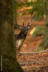Fallow deer, dama dama, stag peeking from behind a massive tree in autumn forest. Vertical front view of a male mammal with large antlers checking out surroundings.