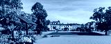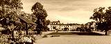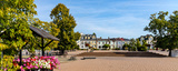 Historic quarter market square with tenement houses and waterworks in old town quarter of Tarnobrzeg in Poland