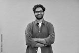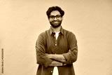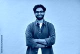 Smiling confident arab young man, male student, professional employee or programmer standing isolated on blue background. Happy handsome ethnic guy wearing shirt and glasses portrait.