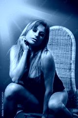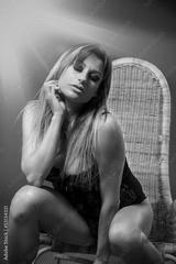 Blonde woman wearing black lingerie while sitting on a chair