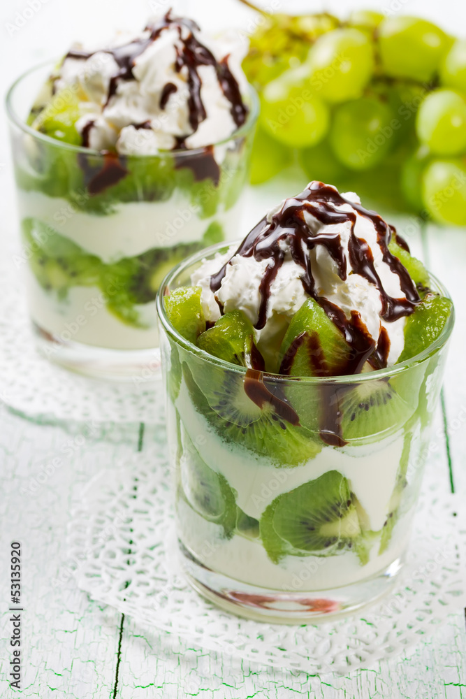 Creamy dessert with chocolate and kiwi fruit