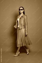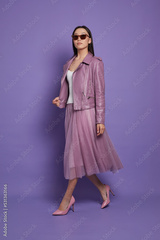 Fashion asian female model. Lilac leather jacket, lilac skirt, heels, sunglasses.