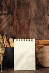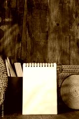 blank sprial notebook with wicker bag and travel stuff on table with sunlight