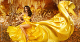 Fashion Model dancing in Golden Silk Dress. Happy Woman in Yellow Gown with waving Fabric Train. Party Girl over Gold Metallic Foil Tinsel Room Decor