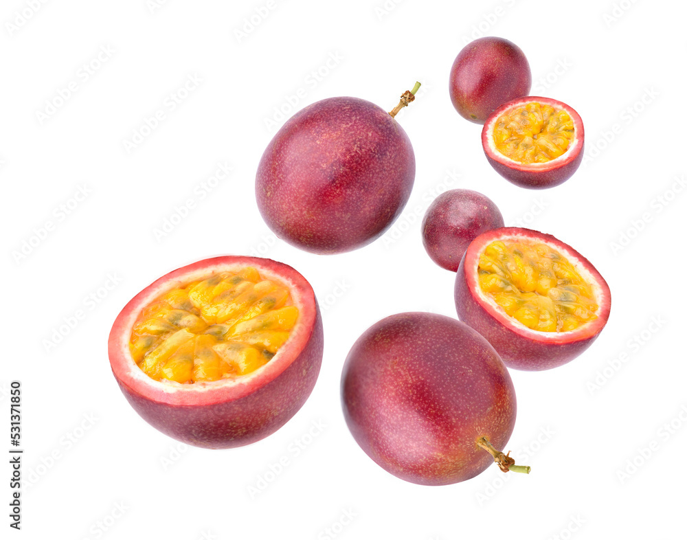 Purple passion fruit (Passiflora edulis) levitate isolated on white background. full depth, Clipping path..