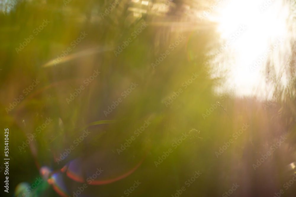 Defocused plants background. Blurry grasses and direct sunlight photo.