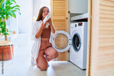 Beautiful cute satisfied happy smiling joyful housewife woman doing laundry at home and enjoying smell of fresh clean linen