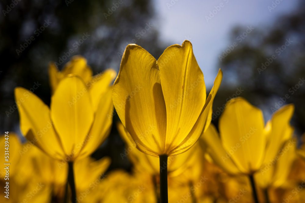 Yellow tulips in focus. Spring flowers concept.