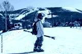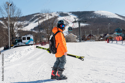 A skier in an orange jacket stands in front of a ski slope in full gear and skis in his hands