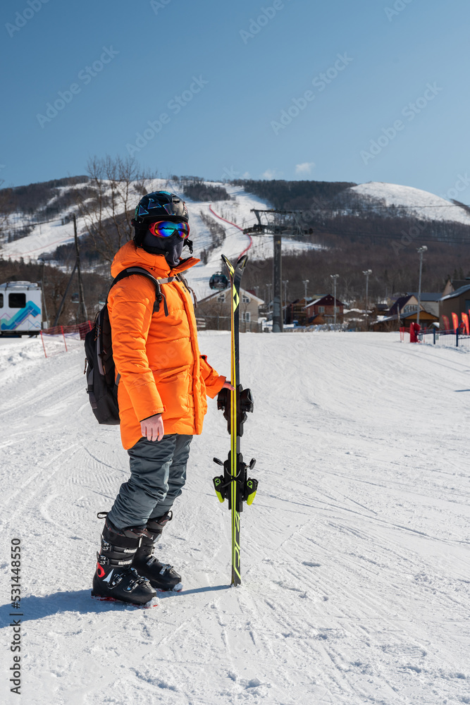A skier in an orange jacket stands in front of a ski slope in full gear and skis in his hands