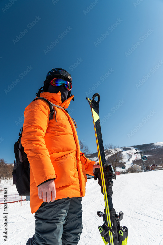 A skier in an orange jacket stands in front of a ski slope in full gear and skis in his hands