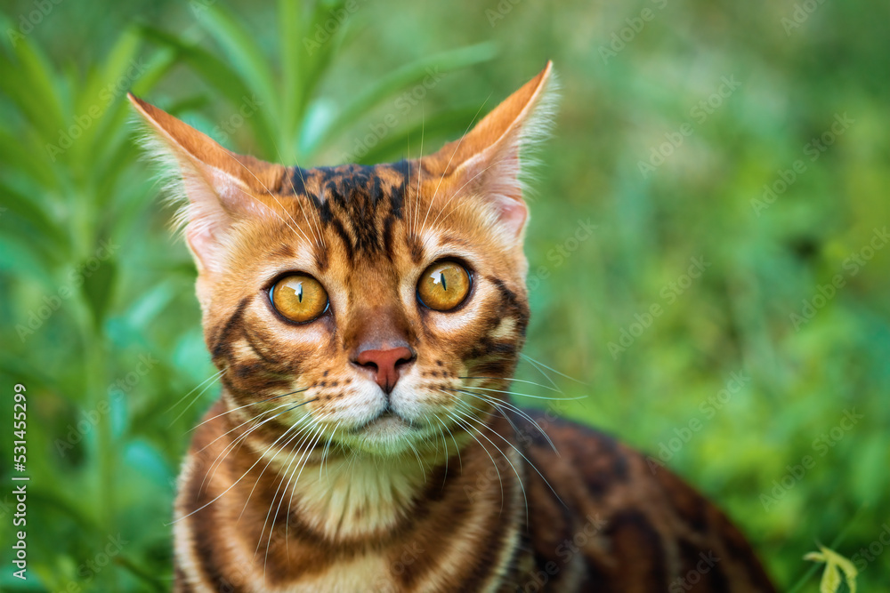 Beautiful young bengal cat in the garden