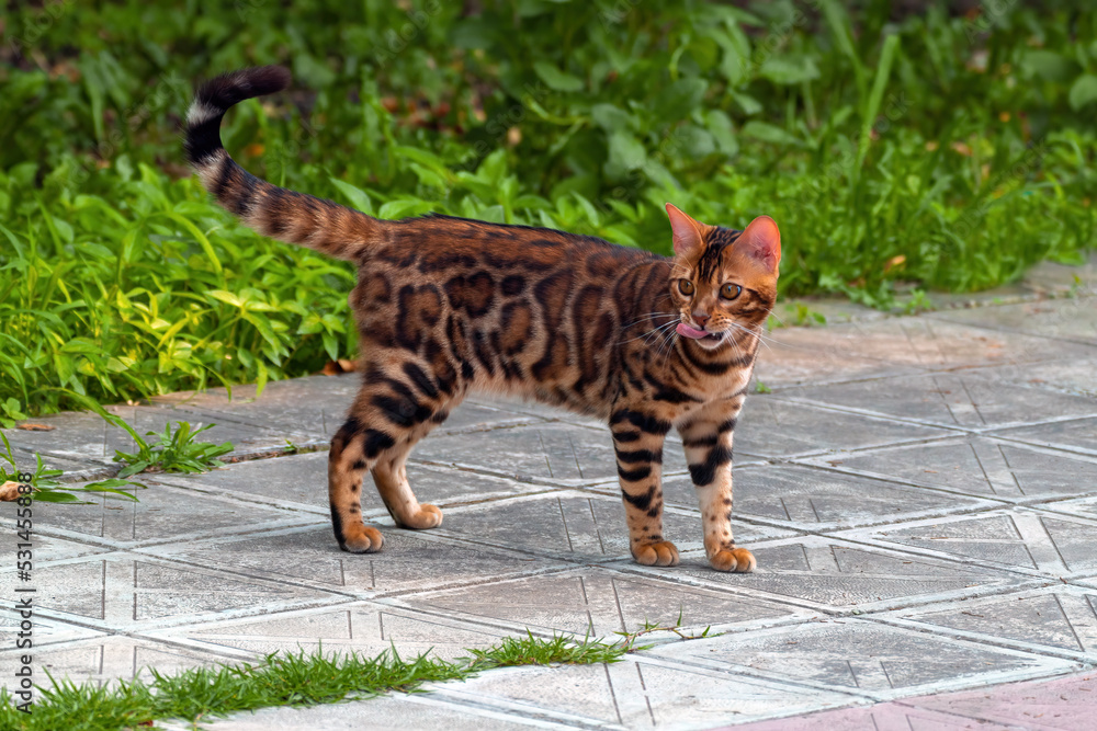 Beautiful young bengal cat in the garden