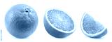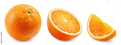 Oranges isolated. Ripe orange, half and slice of orange on a white background. Fresh fruits.
