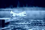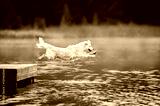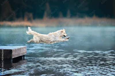 happy golden retriever dog jumping into the lake