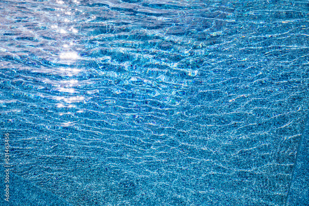 Blue shadows of pool with steps into, sunny summer mood. Ripples water surface, fun recreational outdoor sport background. Abstract swimming aqua texture, natural pattern