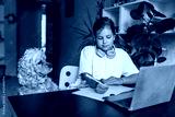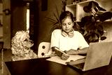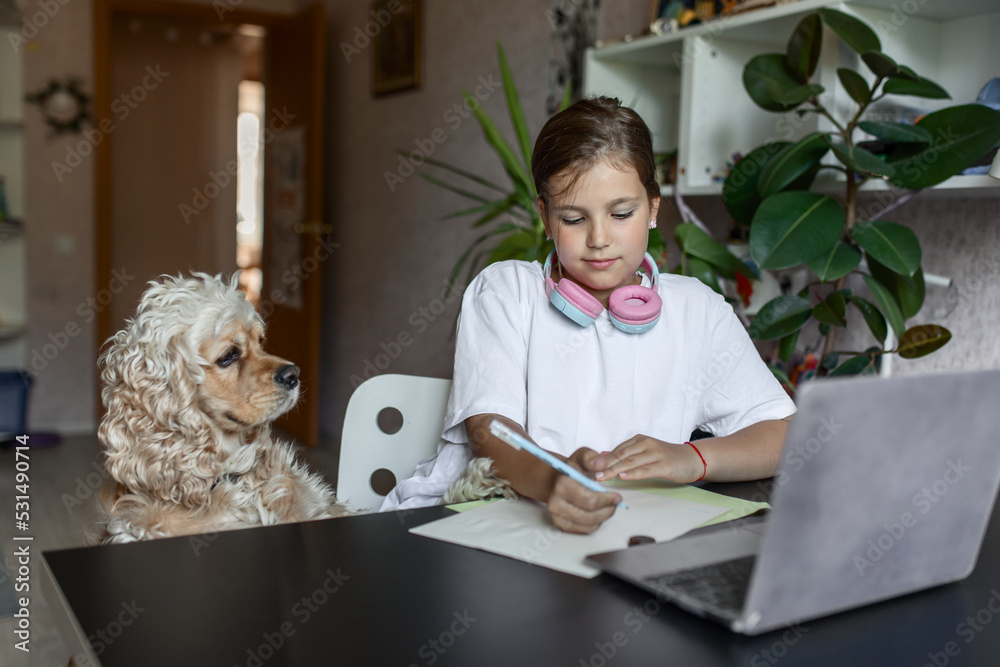 girl of primary school age of European appearance is doing homework, writing in a notebook on a laptop at home with a dog. Concept Back to school, School distance education at home, home schooling