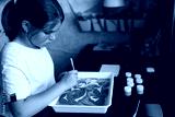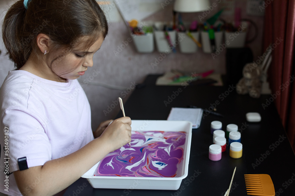 an attractive girl of primary school age of European appearance paints on the water in the ebru technique. The concept of children's creativity