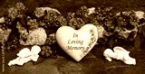Stone heart with the lettering in Loving Memory with flowers and grave angels.