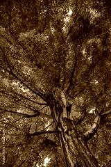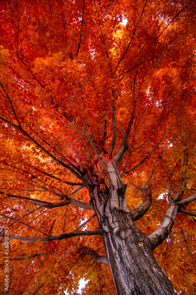 Looking up the trunk of a red maple tree in full fall color
