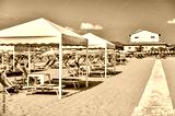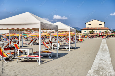 Via Reggio, Italy - July 24, 2022: Beach chairs along the shores of the Mediterranean north of Rome Italy