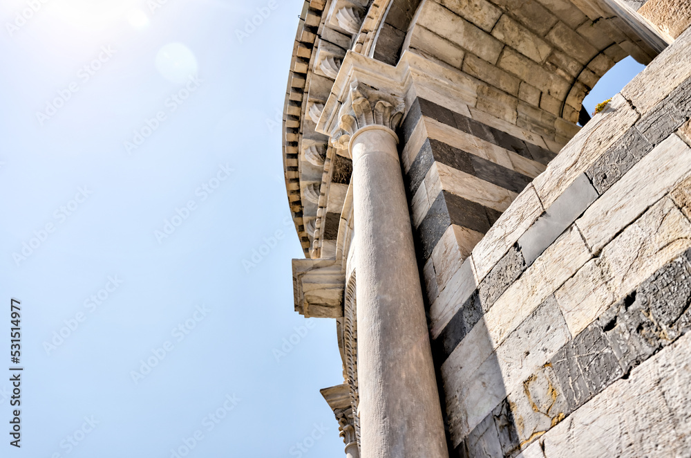 Pisa, Italy - July 24, 2022: Architectural details of the leaning tower of Pisa