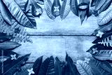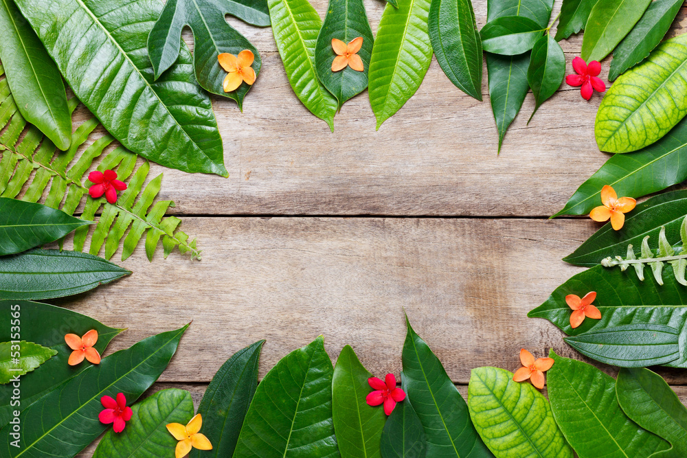 Summer leaves with flowers on wooden background with blank place