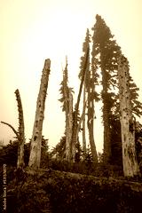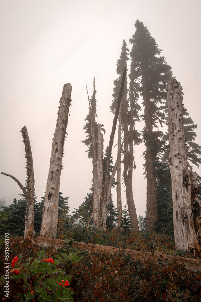 Foggy morning autumn woodland landscape in Mt Rainier National Park, Washington State