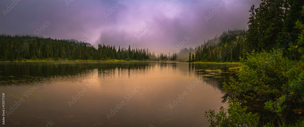 Foggy morning autumn landscape over Lake Reflection in Mt Rainier National Park, Washington State