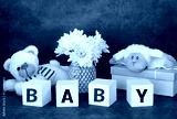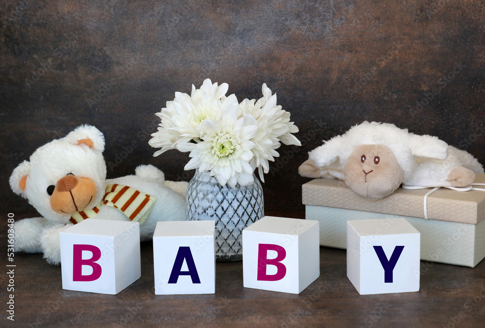 Das Wort Baby aus Buchstabenwürfel mit Spielzeug und Teddybär.