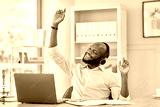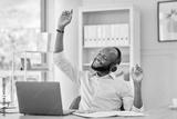 Relax music, headphones dance and businessman dancing to radio podcast, streaming online with laptop and fantasy freedom with web audio for inspiration at work. Employee listening to song on internet