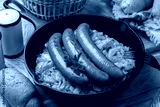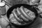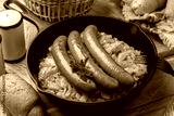 German or Austrian dinner. Wurstel sausage or frankfurter and fried crauti or sauerkraut in a cast iron pan. Bread buns.