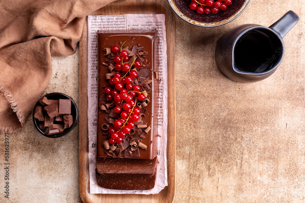 Italian Bonet or Chocolate Pudding Cake or Mousse Jiggly with gelatin and Amaretti, no bake dessert, decorated with red currant. Directly above.