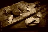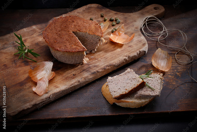 Homemade, baked meat pate. A rustic composition with a meat product on a wooden chopping board.
