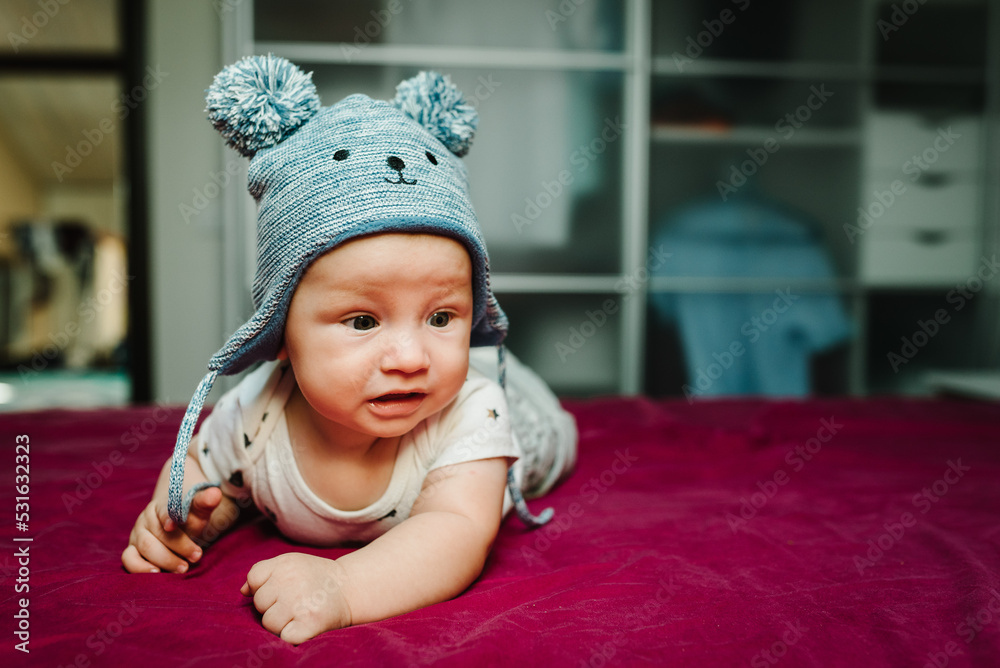 Portrait of a crawling baby on the bed in room. Adorable baby boy weared in hat in bedroom. Newborn child relaxing. Nursery for children. Family morning at home.
