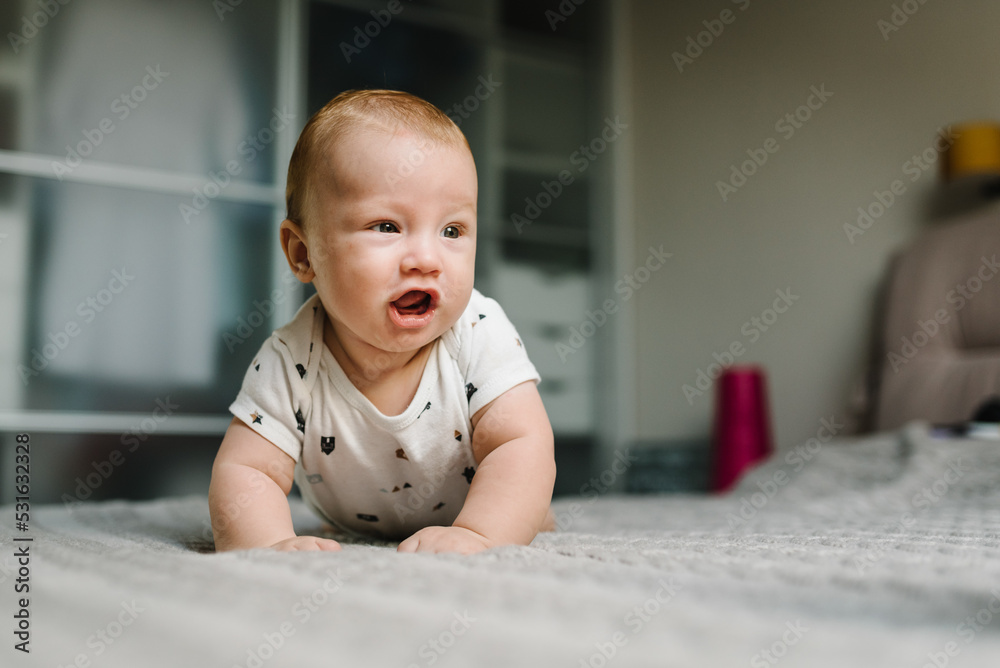 Portrait of a crawling baby on the bed in room. Adorable baby boy in bedroom. Newborn child relaxing. Nursery for children. Family morning at home.