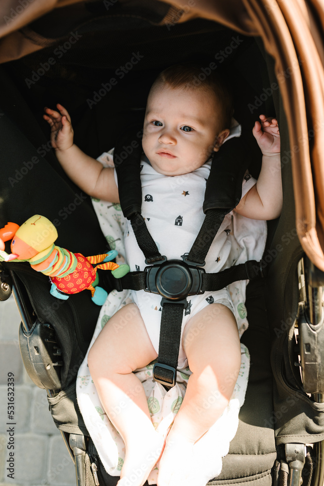 Little boy lies fastened in a stroller. Family walk time, vacation concept. Top view.