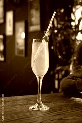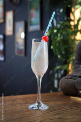 French 75 champagne cocktail with sparkling wine and cocktail cherry garnish, in a tall flute glass, selective focus.