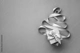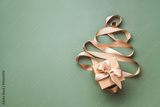 New Year card with concept of Christmas tree made of golden ribbon and gift box on olive background.