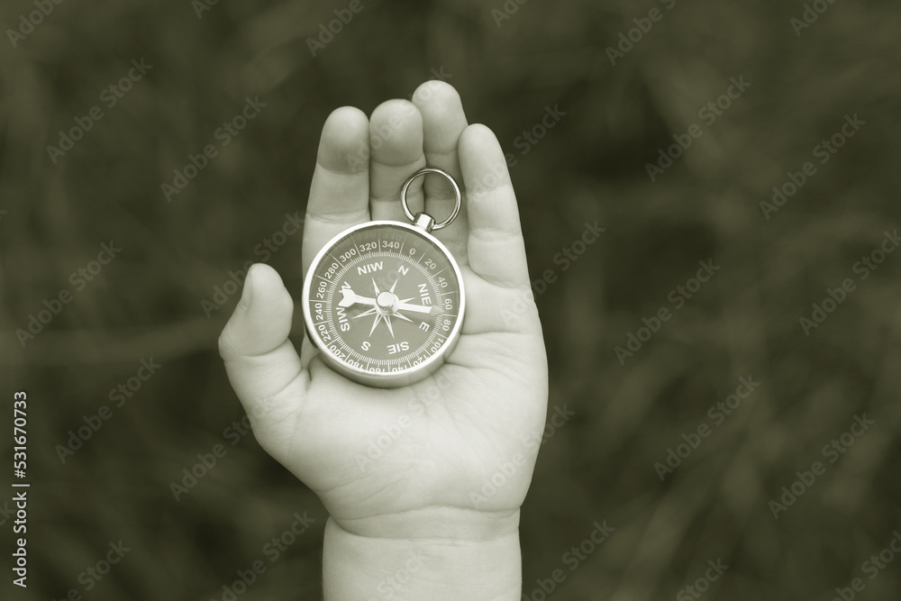Old classic navigation compass in hand on natural background