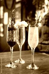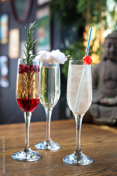 Popular champagne cocktails: pomegranate and rosemary, cotton candy, French 75, in a tall flute glass, selective focus.